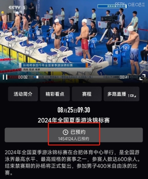 2024年全国夏季游泳锦标赛预赛于8月25日上午开赛。孙杨在400米自由泳项目的第11组,最终以3分54秒98的成绩位列小组第一,以预赛第二的成绩晋级决赛。